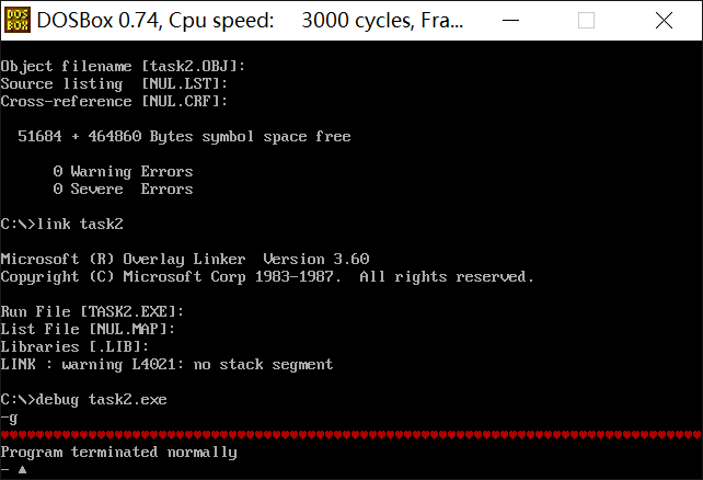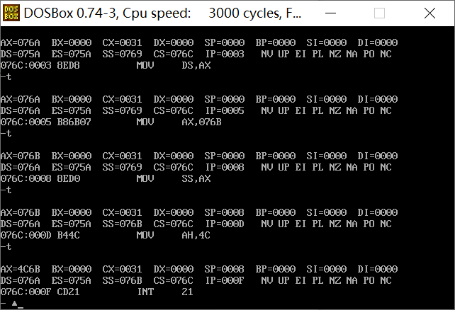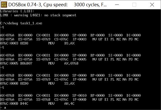 assume ds:data, cs:code, ss:stack code segment start: mov ax, data mov ds, ax mov ax, stack mov ss, ax mov sp, 20 mov ah, 4ch int 21h code ends data segment db 20 dup(0) data ends stack segment db 20 dup(0) stack ends end start