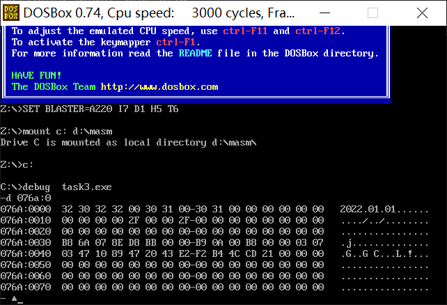 assume cs:code data1 segment db 50, 48, 50, 50, 0, 48, 49, 0, 48, 49 ; ten numbers data1 ends data2 segment db 0, 0, 0, 0, 47, 0, 0, 47, 0, 0 ; ten numbers data2 ends data3 segment db 16 dup(0) data3 ends code segment start: mov ax,data1 mov ds,ax mov bx,0 mov cx,10h s: mov ax,0 add ax,[bx] add ax,[bx+16] mov [bx+32],ax inc bx loop s mov ah,4ch int 21h code ends end start