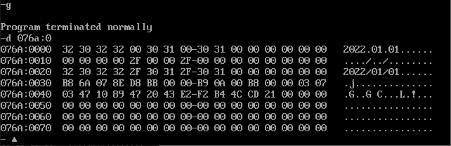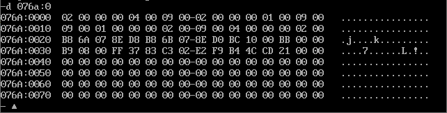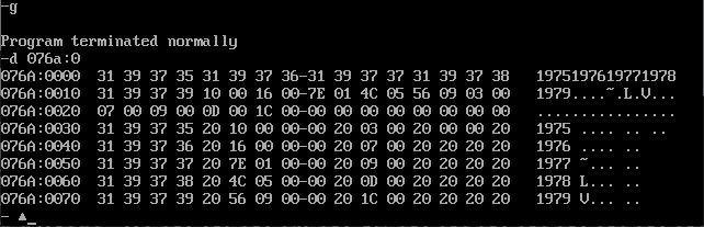 在debug中运行到程序退出之前,使用d命令查看table段对应的内存空间的截图,确认信息是 否按要求结构化地写入到指定内存
