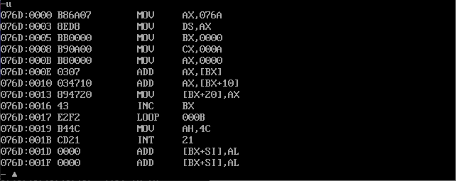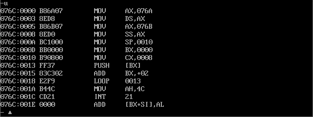 ssume ds:data, cs:code, ss:stack data segment db 16 dup(0) data ends stack segment db 16 dup(0) stack ends code segment start: mov ax, data mov ds, ax mov ax, stack mov ss, ax mov sp, 16 mov ah, 4ch int 21h code ends end start
