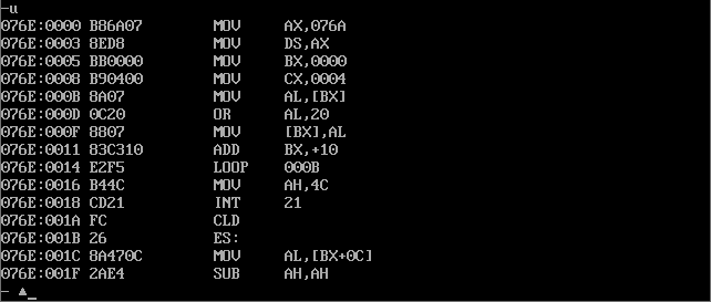 assume ds:data, cs:code, ss:stack data segment db 20 dup(0) data ends stack segment db 20 dup(0) stack ends code segment start: mov ax, data mov ds, ax mov ax, stack mov ss, ax mov sp, 20 mov ah, 4ch int 21h code ends end start