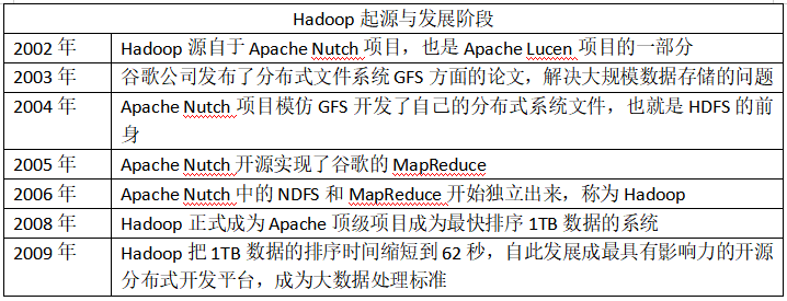 Hadoop源自2002年Apache Nutch——一个开源的网络搜索引擎,并且也是APACHE lUCENE 项目的一部分,2003年谷歌公司发布了分布式文件GFS方面的论文,解决了大规模数据存储的问题;2004年Apache Nutch项目模仿GFS开发了自己的文件系统,也就是HDFS的前身;2008年Hadoop正式成为Apache顶级项目并成为最快排序1TB数据的系统,自此Hadoop发展成大数据时代最具有影响力的开源分布式开发平台,成为事实上的大数据标准。