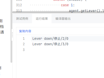 1 while(n != 0){ 2 3 switch(n){ 4 5 case 1://Lever up 6 7 agent.getLever().leverUp(); 8 9 break; 10 11 case 2://Lever down 12 13 agent.getLever().leverDown();//这里少了break 14 15 case 3://Dial up 16 17 agent.getDial().dialUp(); 18 19 break; 20 21 case 4: 22 23 agent.getDial().dialDown(); 24 25 break; 26 27 case 0: 28 29 System.exit(0); 30 31 }