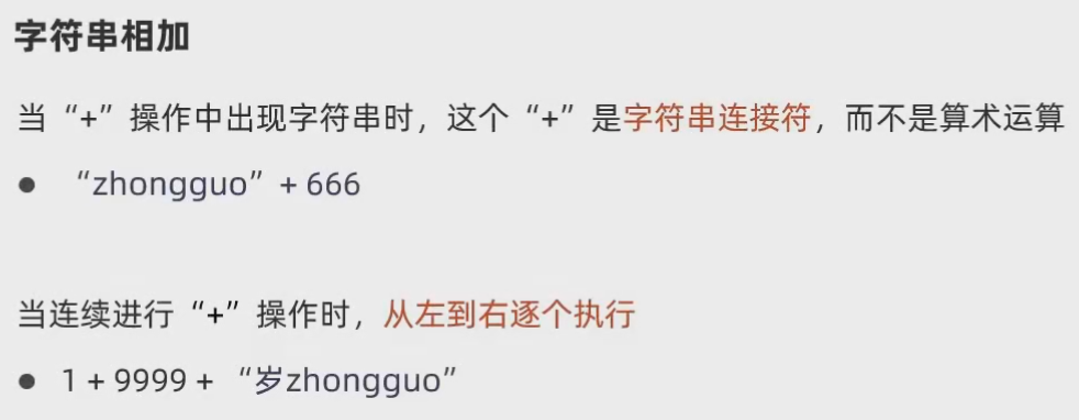 从左向右进行加法运算,若先出现字符串,再出现数字相加,则数字不会进行加法运算,字符串会与后面的数字进行拼接