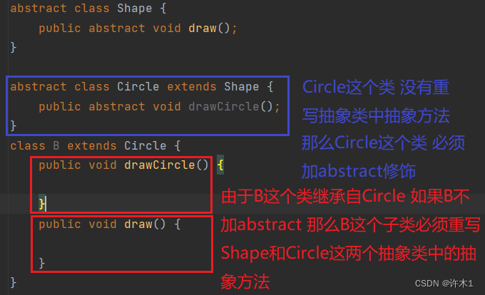 8. 如果普通类继承抽象类后 普通类不重写抽象类中抽象方法 那么这个普通类必须也用abstract进行修饰 如果有类继承这个普通类 那么这个类必须重写普通类和抽象类的抽象方法