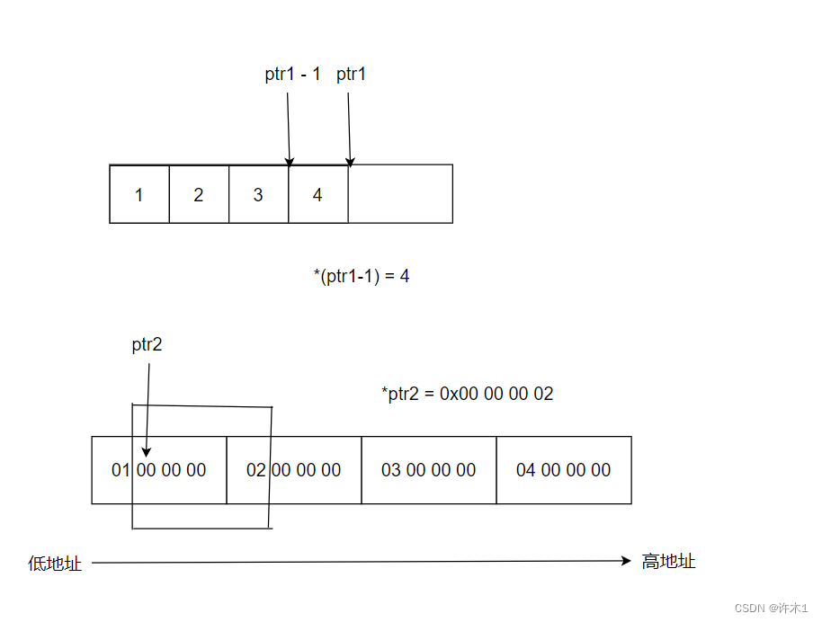 printf("%x,%x", ptr1[-1], *ptr2); // ptr1[-1] = *(ptr - 1)