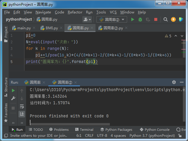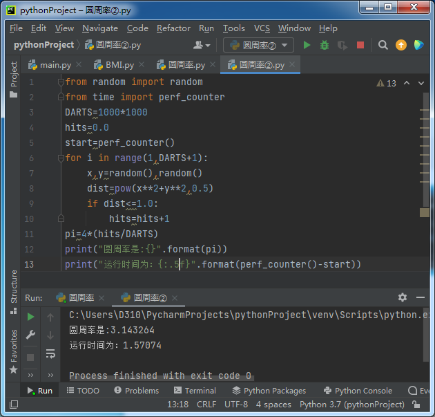 最后跟随老师分别打出了公式法和蒙特卡洛方法计算圆周率的程序