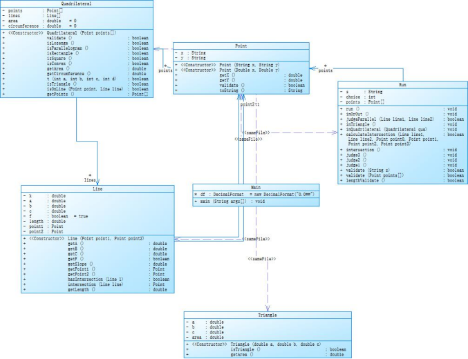 这一题涉及到了一些线之间的计算,明显要比第一题难一些,特别是在判断两条线是否平行的时候,由于我没有最初考虑斜率不存在的情况,所以一直在出错,经过好久的尝试才解决掉。还有一个问题就是两直线交点的判断,我最初一直没有完成交点是否在线段上的判断,也是经过好久的写写改改才完成。