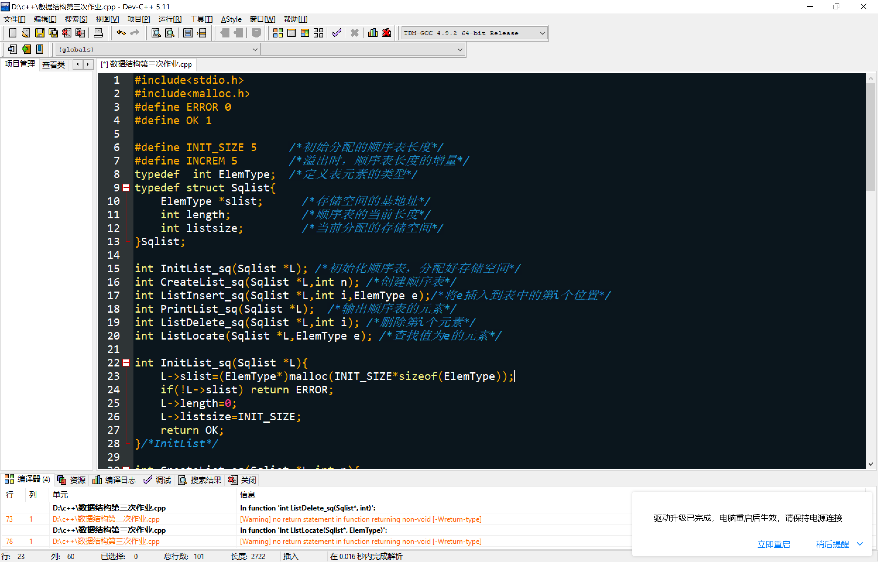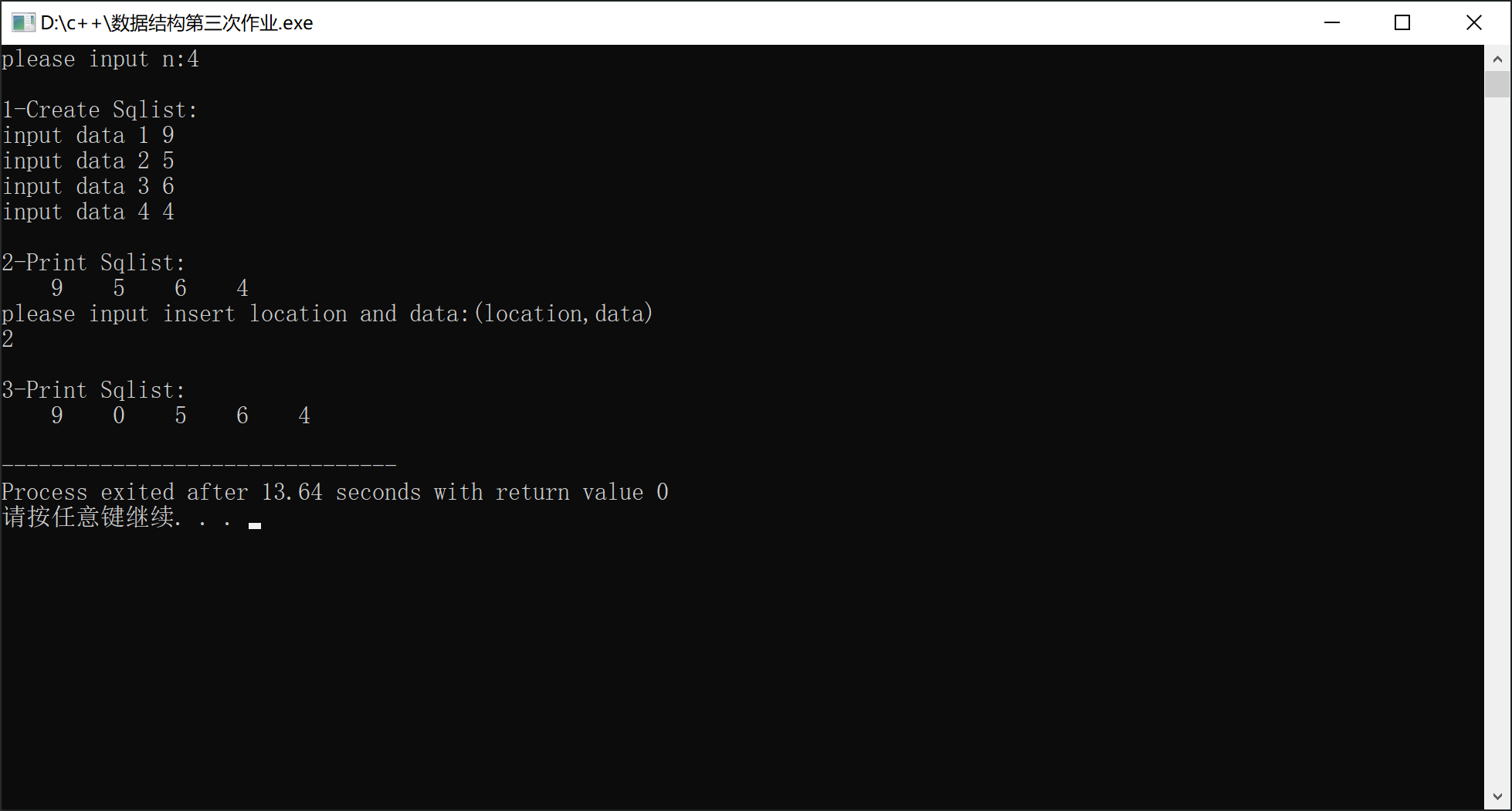 4、为第3题补充插入功能函数和删除功能函数。并在主函数中补充代码验证算法的正确性。