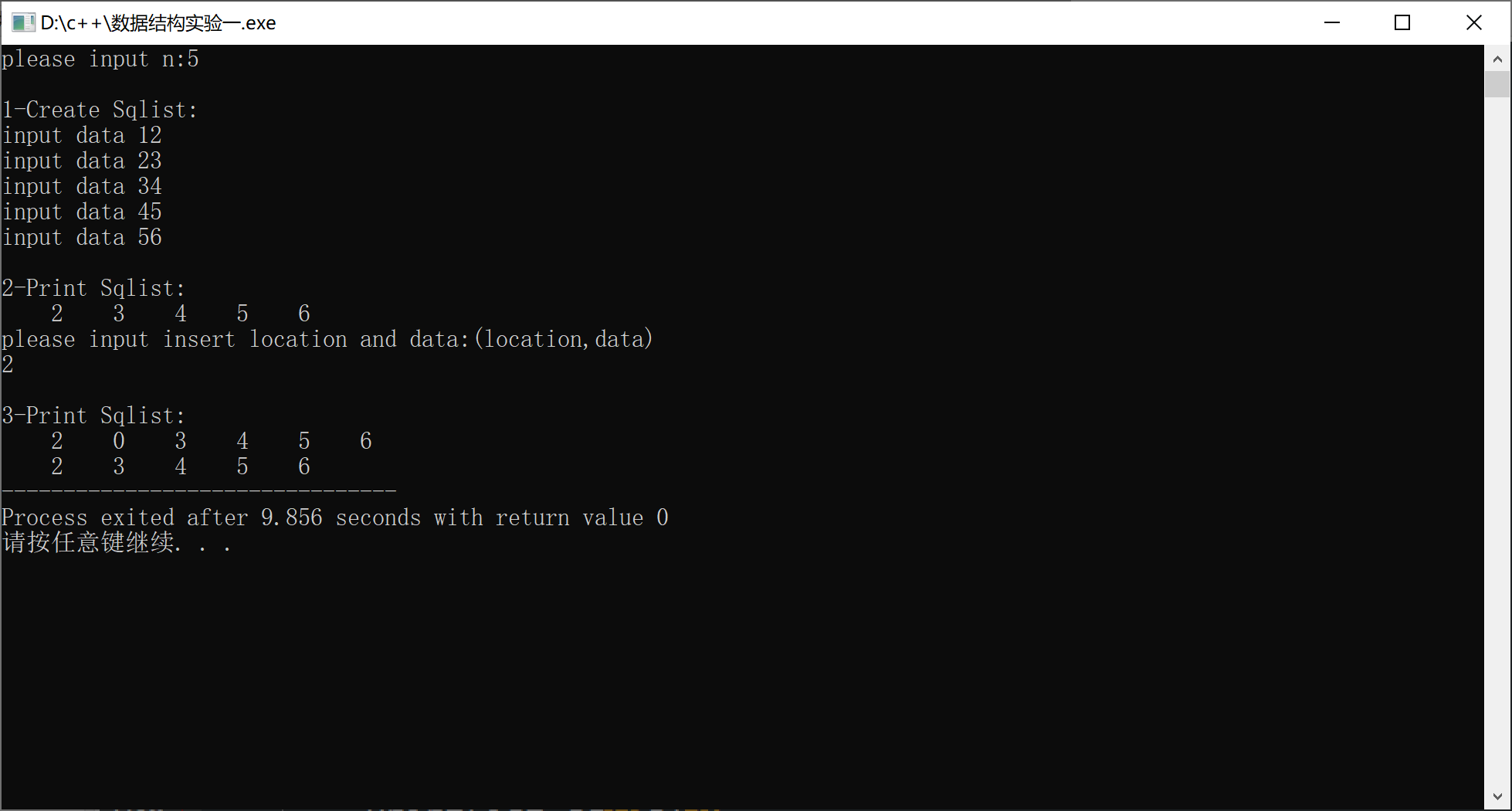 通过本次实验,掌握了线性表中元素的前驱、后续的概念。通过给定的算法,大体了解了顺序表与链表的建立、插入元素、删除表中某元素的算法步骤。通过实验更好地理解顺序表、链表数据结构的特点。在空间性能中,顺序存储结构需要预分配存储空间,分大了浪费,分小了易发生上溢。