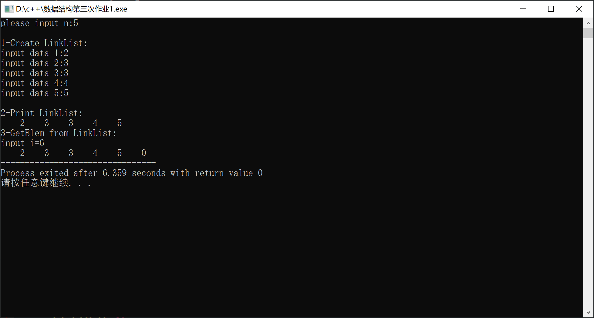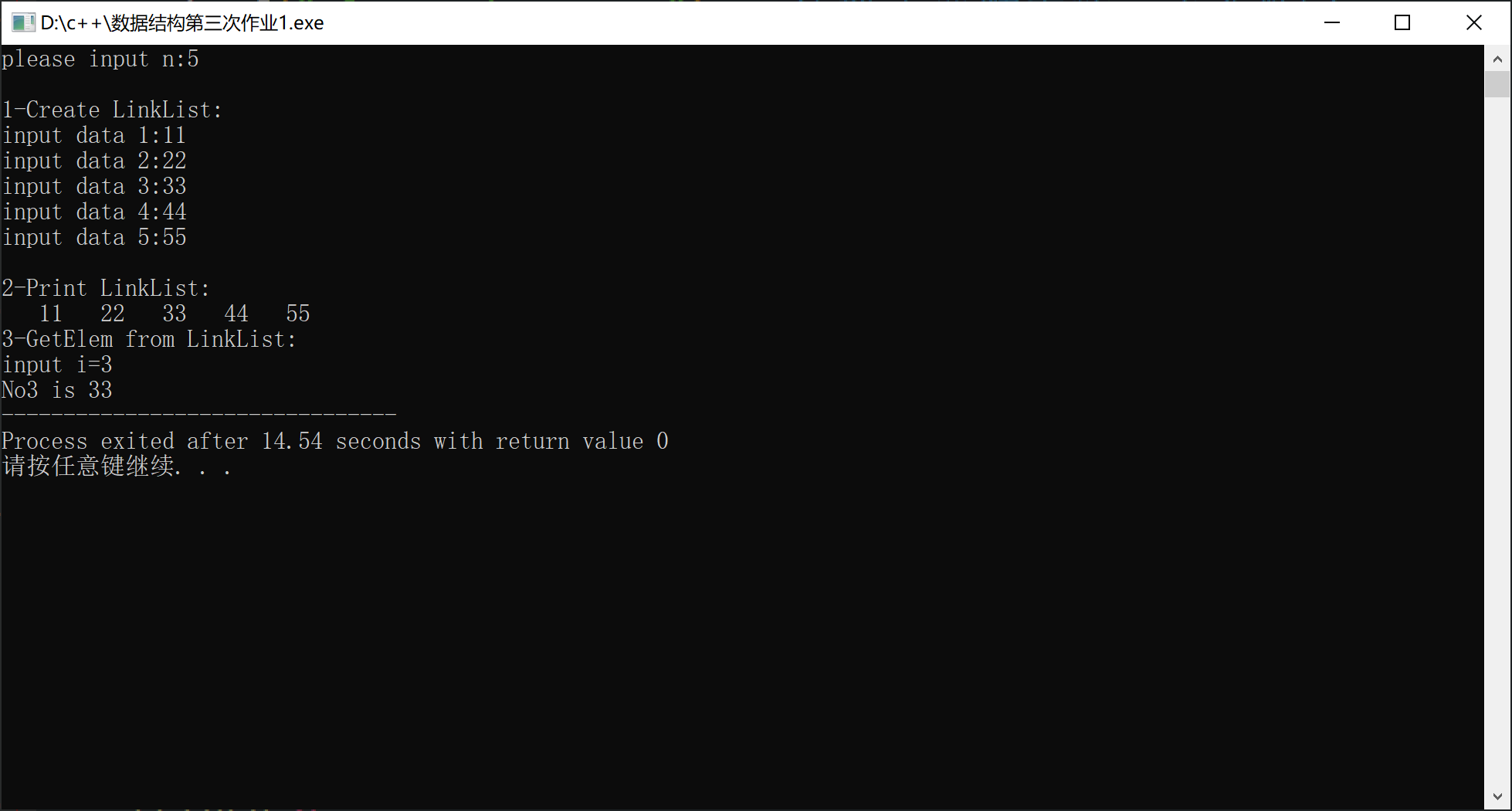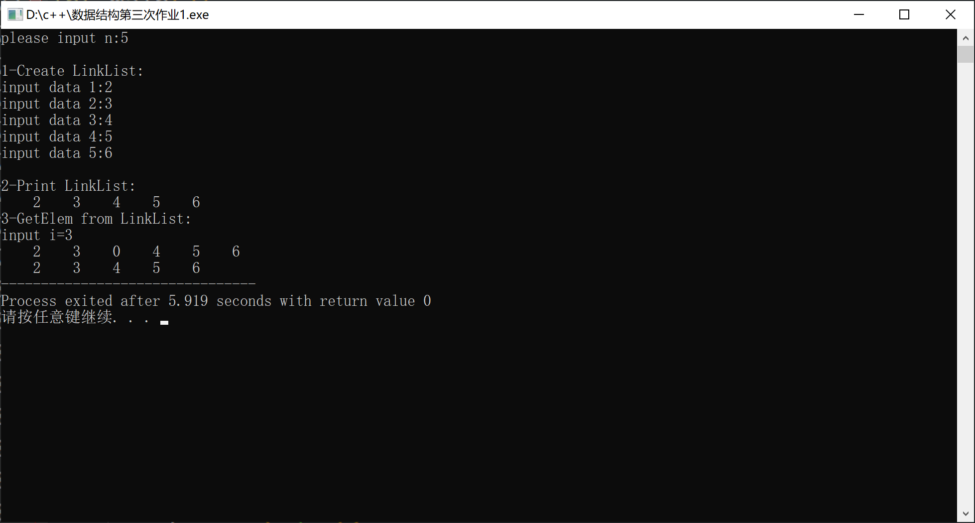 (3)输入插入元素的位置和插入的元素,输出单链表中的值。