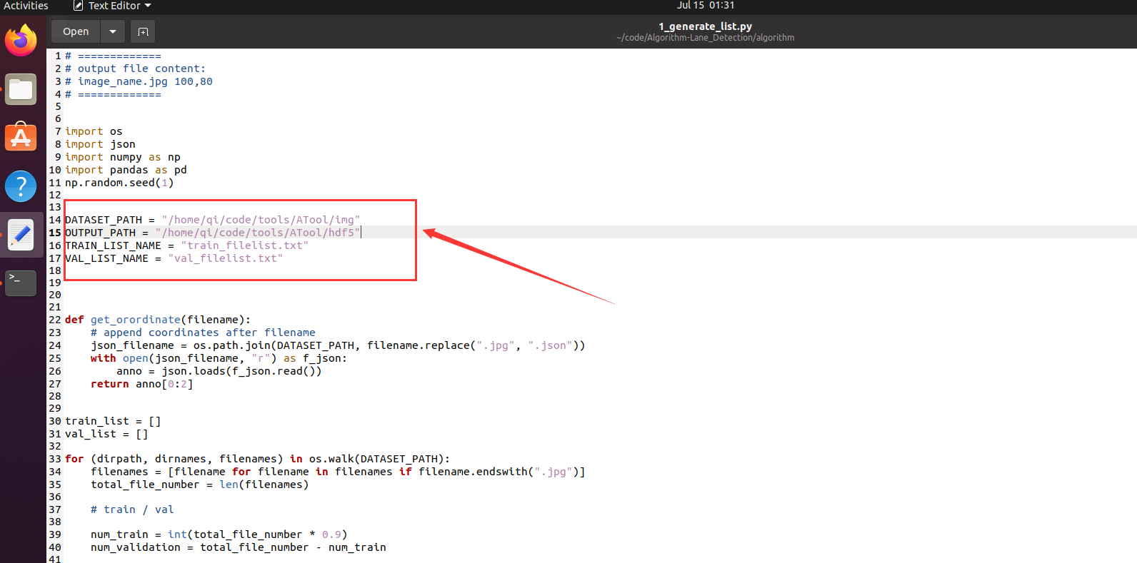 执行代码前,请根据下图提示更改 code/Algorithm-Lane_Detection/algorithm/1_generate_list.py中的路径内容