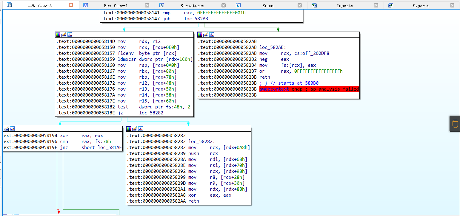 - 控制输入[rdi+0x48]=>r12,[r12+0x18]=>rax,[rax+0x28]=swapcontext+157
