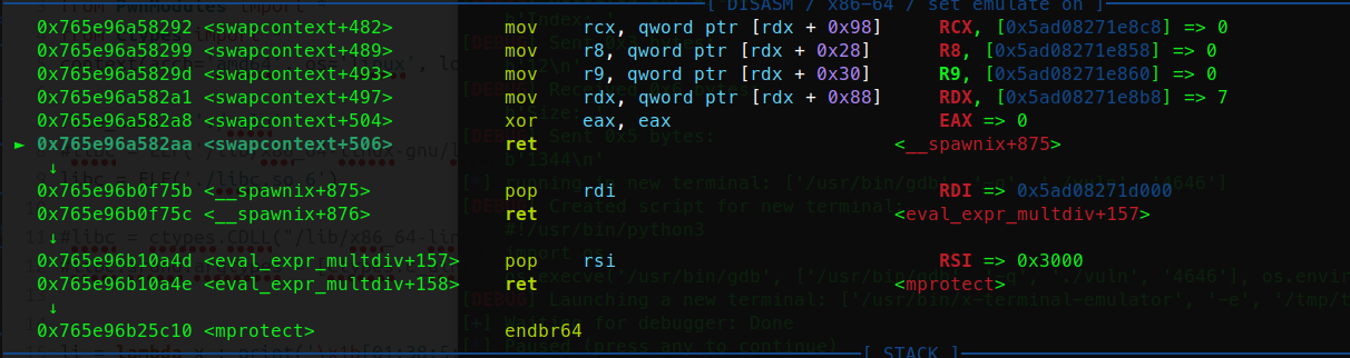 - 调用到swapcontext+157-->r12=>rdx,[rdx+0xe0]=>rcx(rcx要有值,否则运行到fldenv byte ptr [rcx]会卡住),[rdx+0xa0]=>rsp ,[rdx+0xc8]=ret或者pop rdi=>rcx(因为有个push rcx会抬栈)