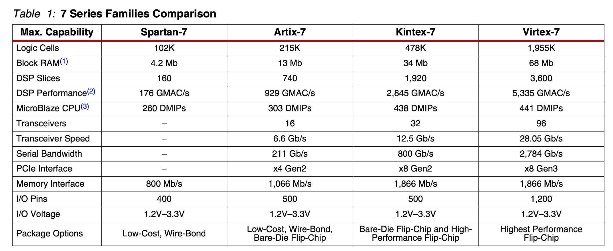 | 属性 | Spartan-7 | Artix-7 | Kintex-7 | Virtex-7 |