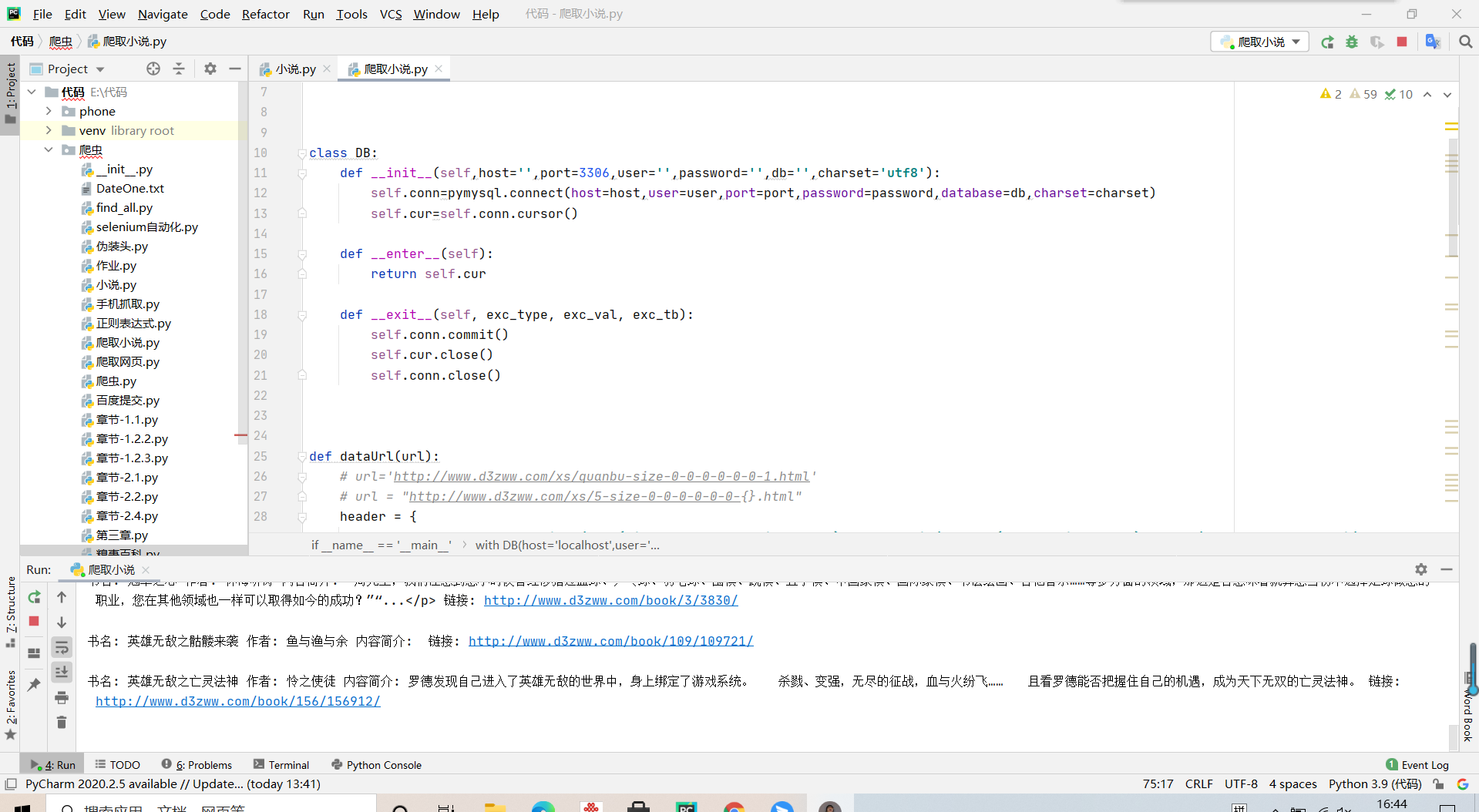 爬取小说的书名简介和作者,在这中间遇到了爬不出来东西的情况,再通过自己查找和小组成员的帮忙,找到发现是标签出了问题。然后就是开始创建数据库吧爬取的数据通过代码的形式存入到数据库中,在这中间要注意很重要的一点就是,对齐列名,要不是会出现报错的情况,还有就是导入数据的时候网络要好不好的情况会出现导不进去,还有报错网络延时等问题。今天在爬取的时候遇到了进不去第二成页面的问题在老师的讲解下可以了解在等数据导入后就可以开始爬去第二成页面了。