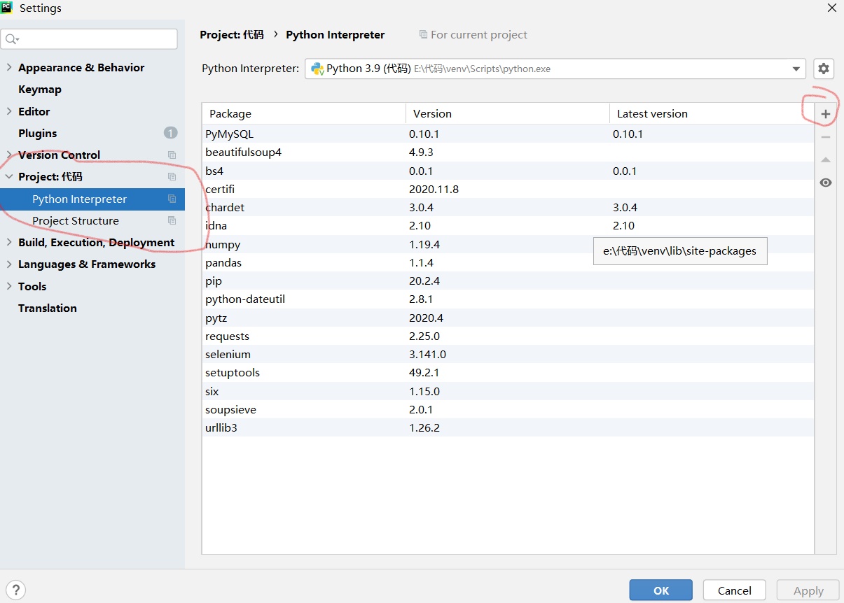 然后进去点击图Project代码在点击Python Interpreter,再点右面的加号
