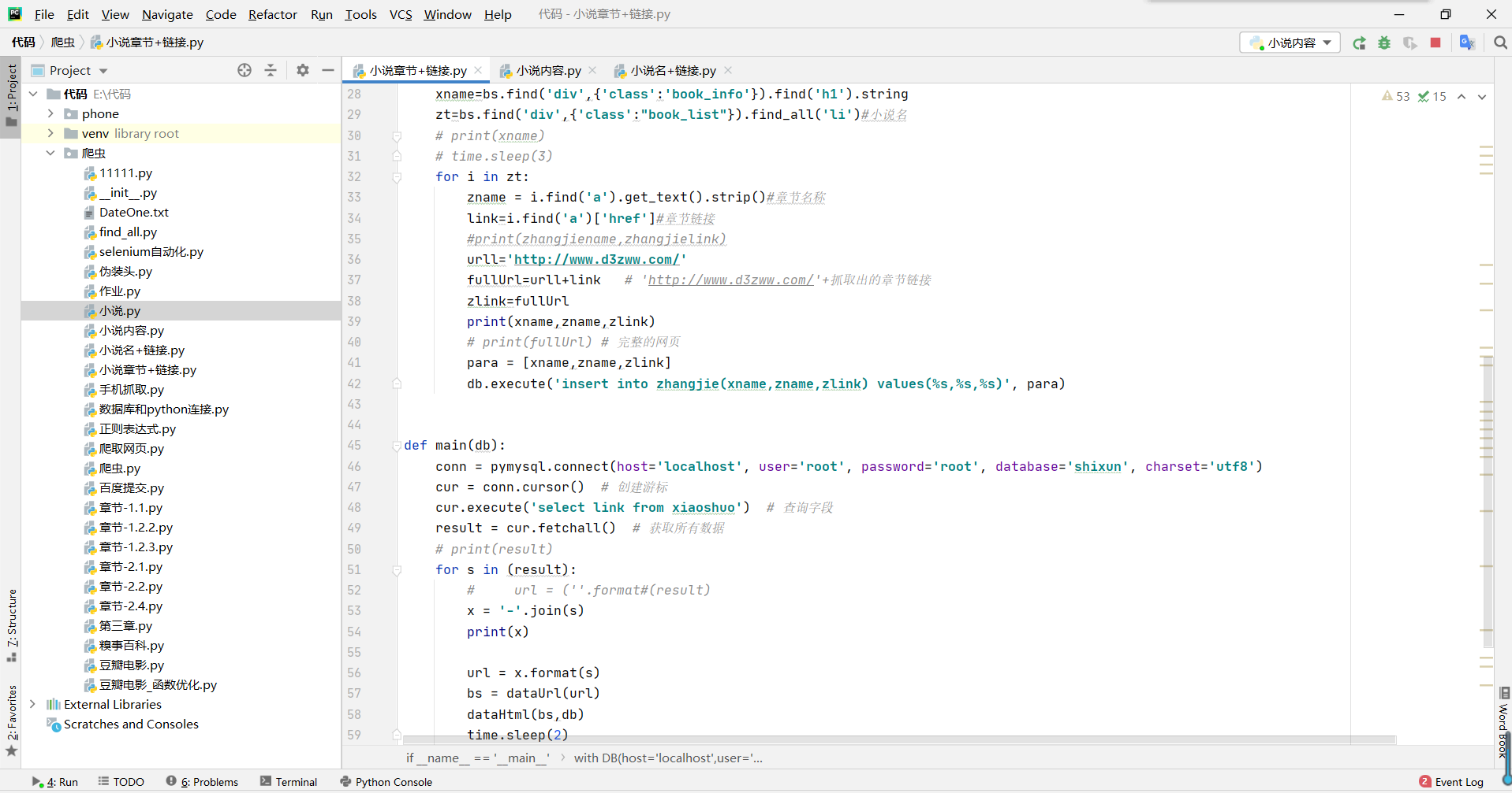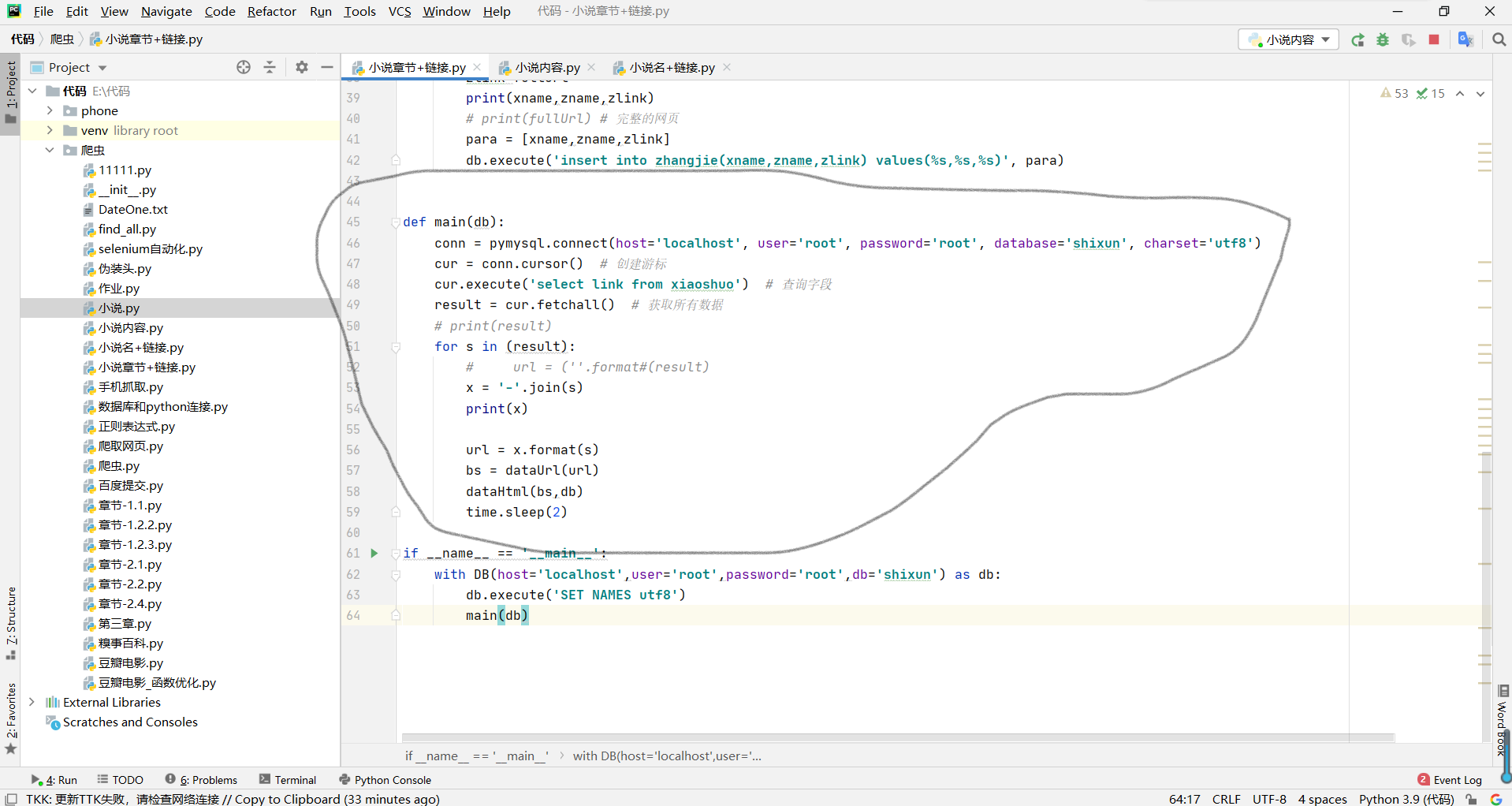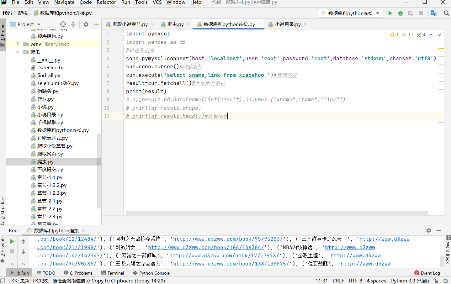 下面这段是最重要的也是有点难理解的因为要在数据库调取链接并进行遍历元组,再要去掉链接的括号和逗号等
