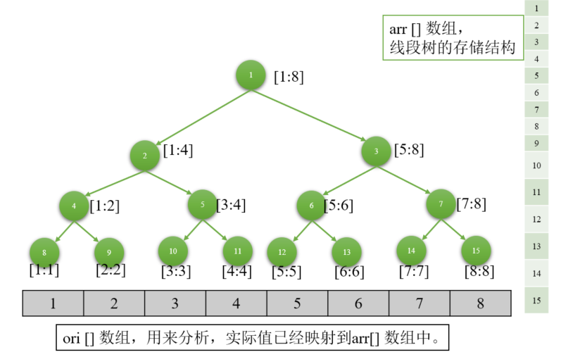 在整个线段树的实现中,我们只有一个数组arr[]用来保存节点的值(某区间内数的和)。原始数组 ori[] 已经被映射到了 arr[] 中,不再单独占用存储空间。
