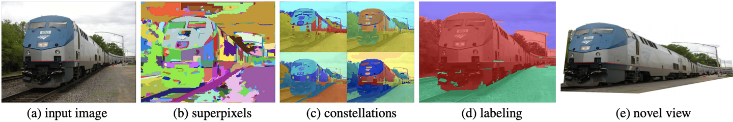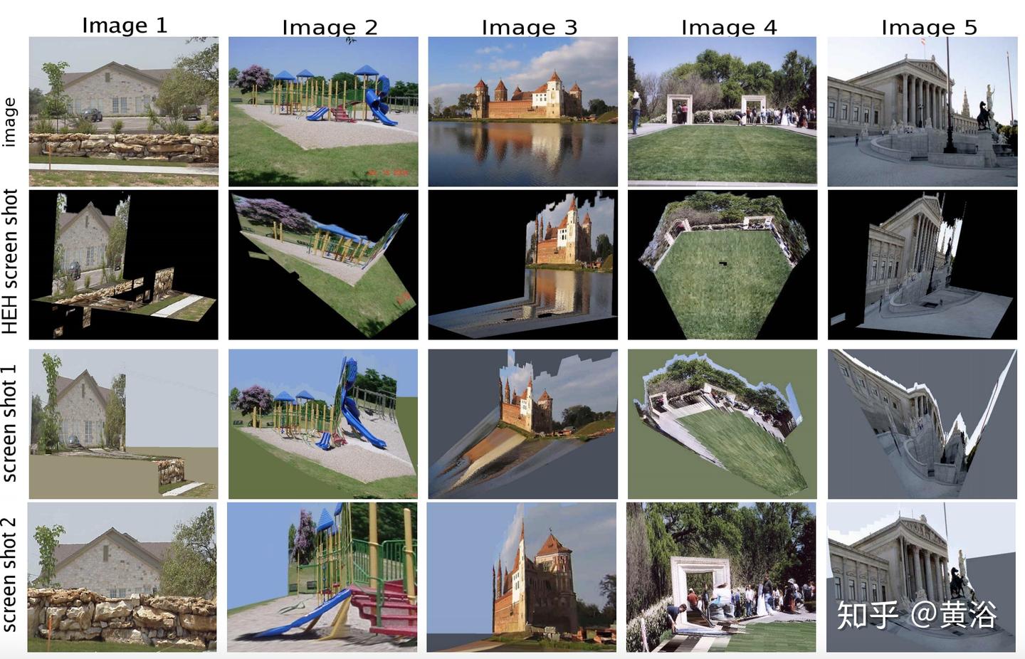 值得一提的是,当时CMU的博士生Derek Hoiem(后来UIUC教授)也在研究如何从单目图像中提取出景物的3-D结构,只是他采用机器学习方法在图像分割基础上做了一个简单的语义分割,即“ground”, “sky”, 和 “vertical”标注像素,然后采用简单的平面billboard做纹理映射后变成“pop-up”的3-D景物:
