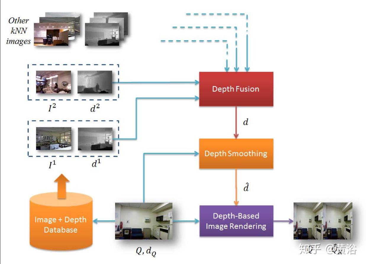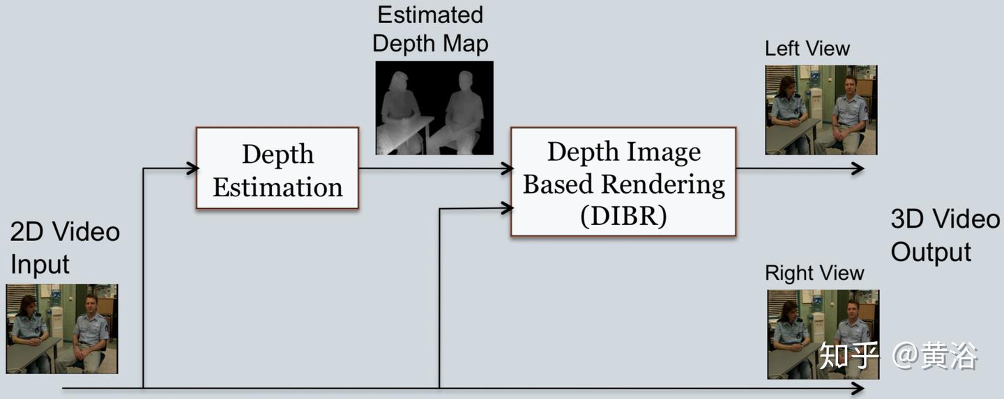顺便提一下,在3维电视热的时期(2008-2010年左右)大家希望把以前拍摄的单目视频变成立体视频,给3-D电视提供更多的内容,包括3-D显示技术的普及(比如红绿眼镜)大家也想在家里share一些3-D的UGC。这个技术被称为2D-to-3D,通过深度图估计和虚拟立体视觉假设可以生成立体视频,其绘制技术称为DIBR,如下图: