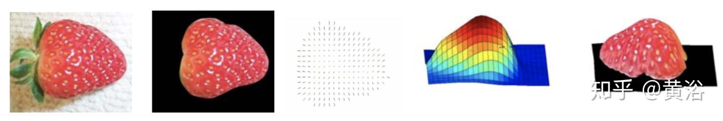 中间第三图是表面法向图,第四个才是深度图。纹理分割是必备的基础(估计是很难的一部分),此外求解这个shape from texture的优化问题,必须加上几个纹理元素(textels)约束条件:homogeneity,isotropy,stationary。