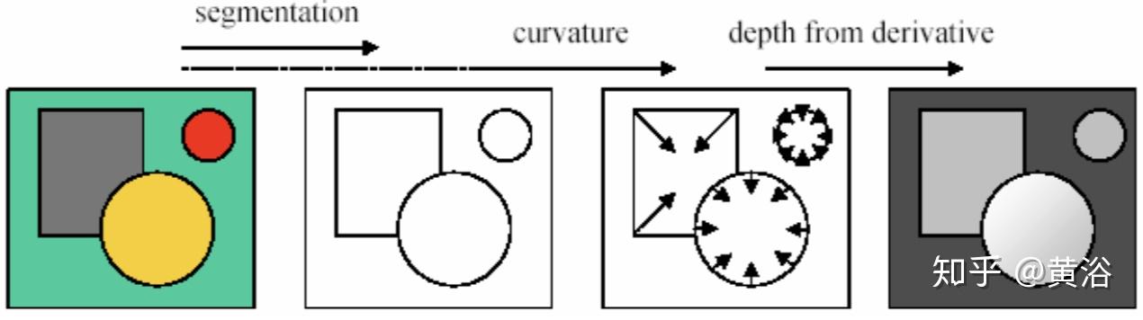 遮挡(occlusion)也是深度的一个线索,曲率(curvature)是其中的一个体现,即shape from curvature。isophote这个词指一种封闭的物体外轮廓,一般通过对图像灰度设门限可以得到,而它的曲率用来推导对应该门限的深度,见下图所示。门限在【0,255】范围变化就能得到最终叠加平均的深度图。分割仍然是一个求解遮挡的基础,要知道当时分割算法是计算机视觉很头疼的难题,俗称“chicken-and-egg"。