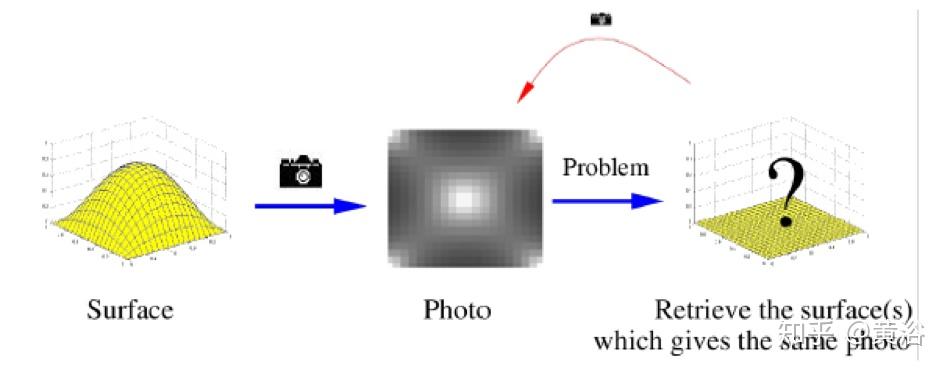 物体表面阴影的变化可以提供深度的信息,利用图像亮度和其中物体表面的形状之间的关系,即Shape from shading。和SFM一样,这是一个病态问题,需要附加约束条件,如物体表面的特性。SFS一般假设四种表面模型:纯Lambertian,纯镜面,混合和更复杂的模型。大部分情况下都是Lambertian,即均匀照明的表面从任何一个方向观察其亮度不变。其目标函数是一个积分,求解的算法比较复杂,类似有限元之类。