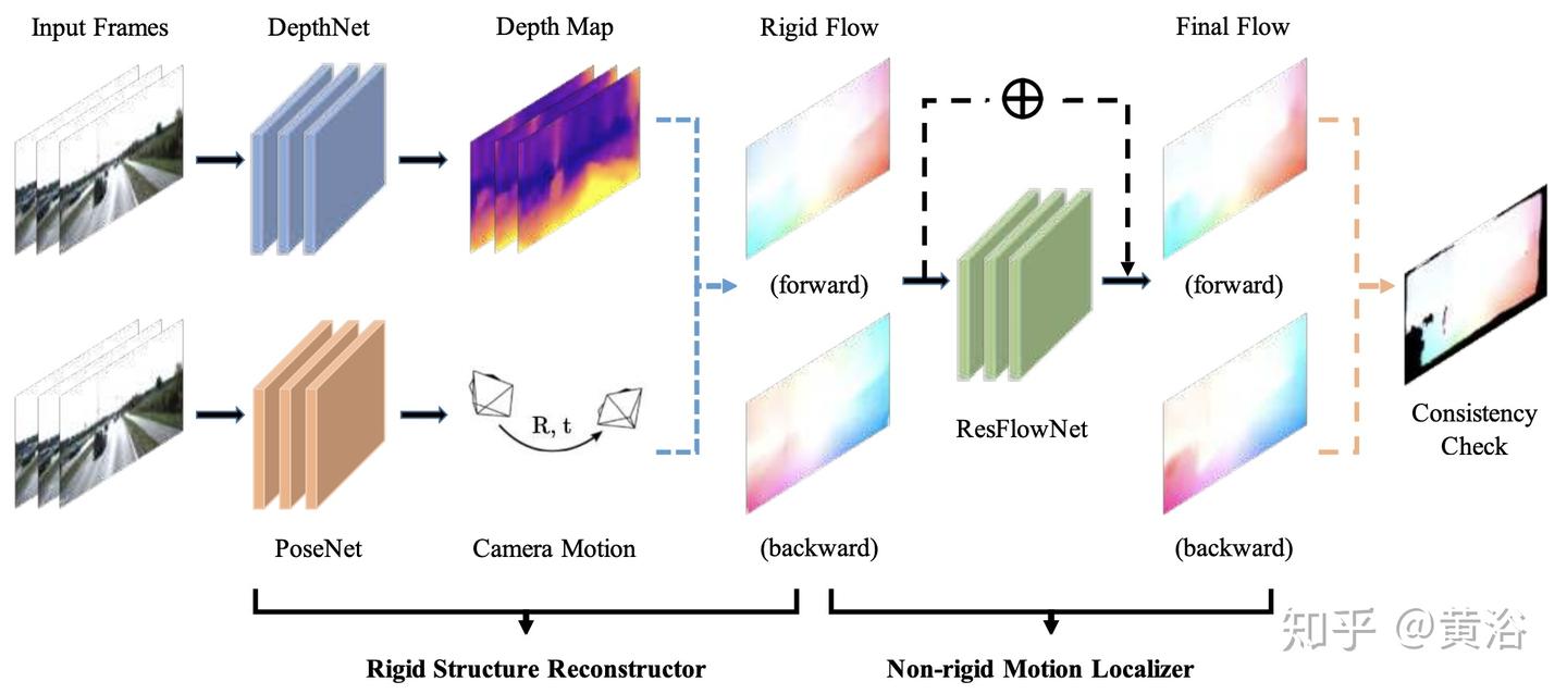 谷歌最近的工作延续了camera motion的结合,同时加上了其中物体各自运动的信息:可以认为是将optic flow分成了camera ego motion和object motion的工作,和加入语义分割有类似的思路吧,文章发表在AAAI‘19.