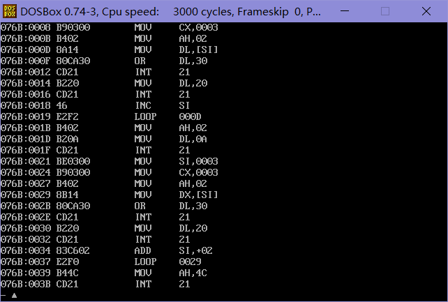 assume cs:code, ds:data data segment x db 1, 9, 3 len1 equ $ - x y dw 1, 9, 3 len2 equ $ - y data ends code segment start: mov ax, data mov ds, ax mov si, offset x mov cx, len1 mov ah, 2 s1:mov dl, [si] or dl, 30h int 21h mov dl, ' ' int 21h inc si loop s1 mov ah, 2 mov dl, 0ah int 21h mov si, offset y mov cx, len2/2 mov ah, 2 s2:mov dx, [si] or dl, 30h int 21h mov dl, ' ' int 21h add si, 2 loop s2 mov ah, 4ch int 21h code ends end start