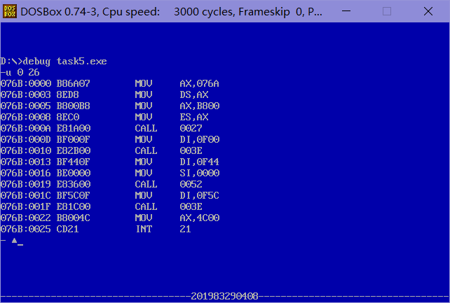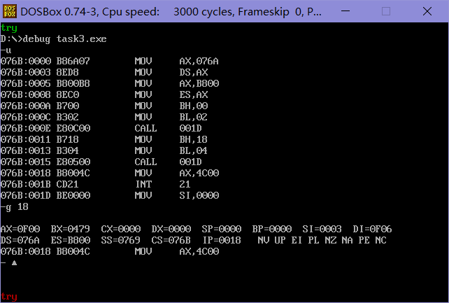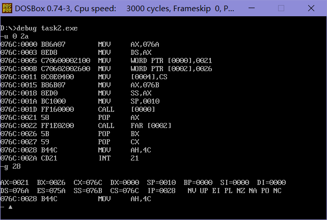 ② 对源程序进行汇编、链接,得到可执行程序task2.exe。使用debug调试,观察、验证调试结果与理论分析结果是否一致。