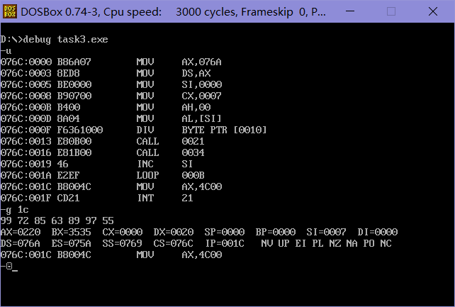 assume ds:data, cs:code data segment x db 99, 72, 85, 63, 89, 97, 55 len equ $- x data ends data1 segment db 10 data1 ends code segment start: mov ax, data mov ds, ax mov si, offset x mov cx, len s1: mov ah, 0 mov al, ds:[si] div byte ptr ds:[10h] call printNumber call printSpace inc si loop s1 mov ax, 4c00h int 21h printNumber: mov bx, ax or bl, 30h or bh, 30h mov ah, 2 mov dl, bl int 21h mov dl, bh int 21h ret printSpace: mov ah, 2 mov dl, ' ' int 21h ret code ends end start