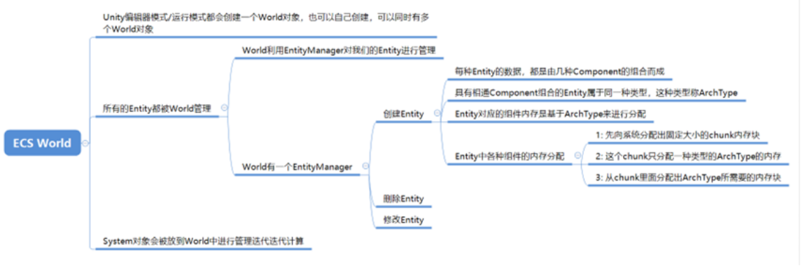 DOTS中会有一个World对象,每个Word对象会有一个EntityManager负责Entity的管理,内部使用了高效的基于ArchType与Chunk机制的内存分配。所有的system会加入到World里面来进行统一迭代,System可以访问Entity中的Component数据。同时JobSystem可以让我们的算法迭代基于多线程处理。配上总结图如下:
