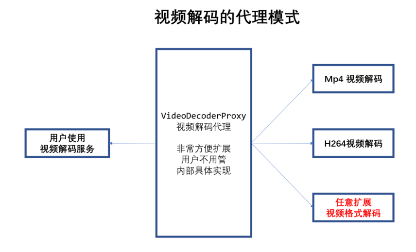 当播放器开发者来调用视频解码库的时候,只要调用视频解码库代理的接口,