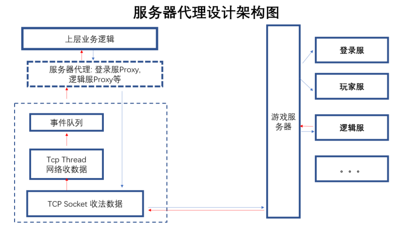 经过上面的例子和伪代码的讲解,相信你对代理模式有了一个比较深刻的认识,接下来我们来分享一个代理模式在游戏开发设计中的经典案例。当我们开发网络游戏的时候,我们的客户端要与服务器进行通讯,而服务器分布在云端的不同的机器上,同时随着服务器部署的变化,我们也会要修改访问服务器的方式和方法。一般做这类客户端网络设计的时候,我通常会采用代理模式,把云端的每个服务抽象成代理,比如用户登录AuthProxy, 系统商城的MallProxy, 逻辑服LogicProxy。这些Proxy提供对应的服务的接口给上层的开发者来使用,如Connect, Login等,Proxy内部来实现具体的部署和通讯细节,比如AuthProx我们要连接哪里,游客登录的具体通讯协议数据是什么等。通过代理,把与游戏服务器通讯部署等的变化与上层的业务逻辑分离出来。