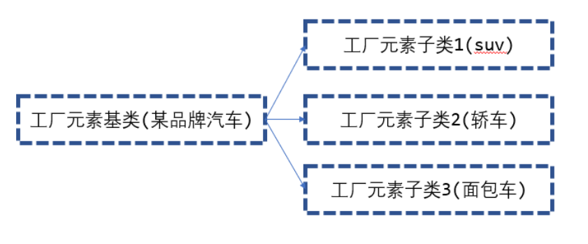 首先是要定义和规划我们工厂模式创建出来的对象,我们可以成为”工厂元素”。这些工厂元素都属于不同的类型(上面例子中的不同型号的某品牌汽车),这些类型都属于同一个基类(某品牌汽车,具有汽车的通用功能)。所以工厂元素的设计规划就是 基类+子类的模式,基类提供对外使用的接口(如汽车的功能), 而子类定义具体的不同的类型。如果要新增一种类型,那么只要继承自这个基类就可以了。