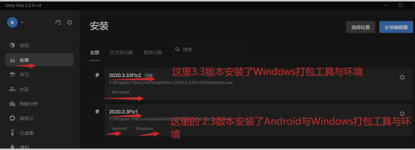 从Unity Hub安装与引擎版本对应的JDK, NDK,SDK,我只要打开Unity Hub,点击”安装”,Unity Hub就会帮你列出目前你安装的所有的Unity版本以及每个Unity版本安装了那些平台的打包工具,如图所示: