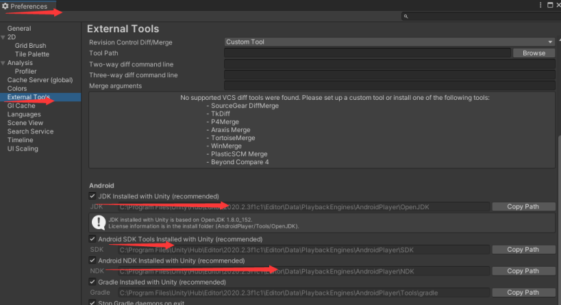 正常情况下,直接下载当前Unity 版本编译Android需要对应的JDK, NDK, SDK都可以安装好。如何都安装好了,我们打开Editor/Preferences菜单, 在External Tools,能看到Android这一栏,JDK,NDK,SDK是否都安装好了,如果安装好,就没有警告,如果没有安装,就会有黄色的感叹号。