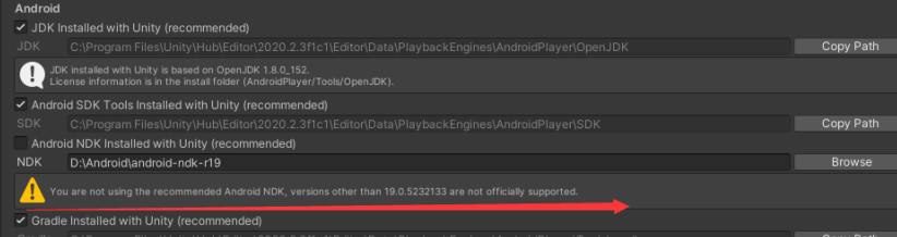 修改完成后,你再回到上面的External Tools,你发现还是提示这个问题,这个问题需要把NDK放到Unity默认的路径下,所以我们拷贝默认路径,进入对应的目录,如果没有NDK文件夹,新建一个NDK文件夹,然后把之前下载的NDK文件移动到这个文件夹下,即可。这样Unity编译Android要用的JDK, NDK, SDK都全部安装好了,黄色感叹号的警告提示也没有了。