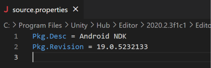 但是由于网络限制(没有梯子),可能会导致JDK, NDK, SDK下载失败,通常NDK下载失败的概率会更大一些。如果下载失败了,这个时候,我们就需要手动安装,我们拿NDK下载失败举例,我们可以在网络上下载一个NDK,那么这个Unity NDK的版本如何看呢?我们可以去掉Android NDK Installed with Unity 这个勾选框,选一个NDK的文件夹,如果NDK的版本不匹配,就会提示你它需要的对应的NDK的版本号, 如上图为19.0.5232133, 这个时候我们就可以到网络上去下载大的版本号为NDK 19的版本。NDK 大版本下载下来以后,小版本不一定能对上号,可以去找对应的小版本,也可以修改下载的NDK的版本号,打开NDK文件夹下的source.properties文件(用记事本等文本编辑器打开),如图,直接修改版本号为要求的小版本号(19.0.5232133)。