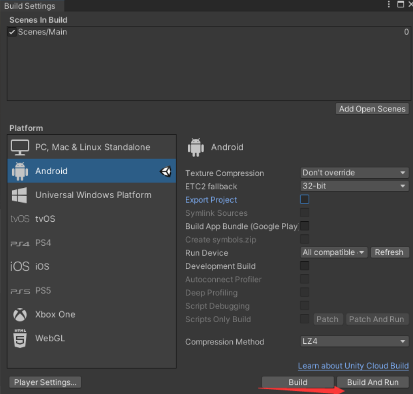 环境安装好后,打包一键就可以完成。首先我们打开File/Build Settings菜单,选Android平台,直接选Build 就可以了,如下图所示