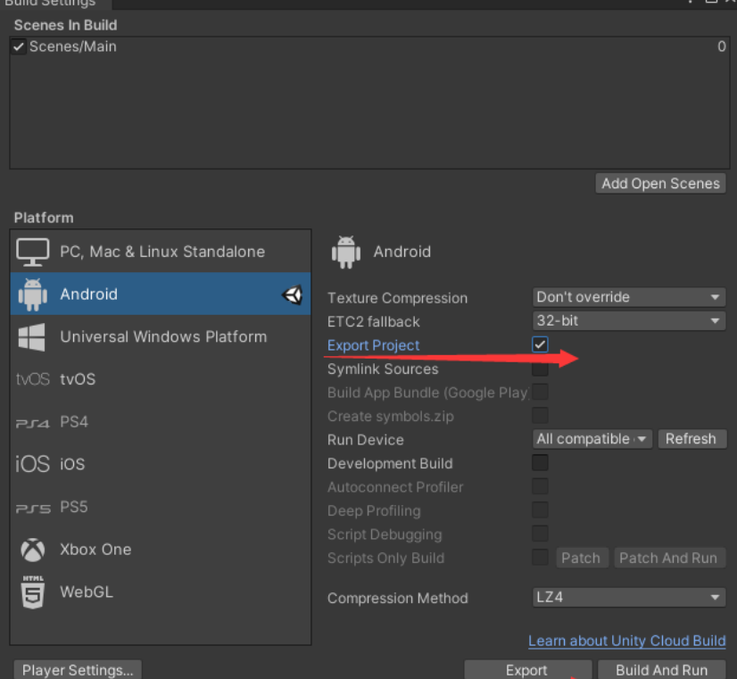 这样Build完成以后,游戏的apk的包直接就出来了。Unity把整个打包编译环境做成了一键打包的模式,如果要对接SDK这些,可以直接在Plugins/Android下放好SDK所需要的一些库,然后再根据文档对接。对接的时候我们需要Android项目,这个时候我们需要将Android项目导出来,那就可以在Build Settings里面勾选Export Project。这样就可以生成Android的项目出来, 导出来后方便我们对接SDK。导出后项目的目录结构如下: