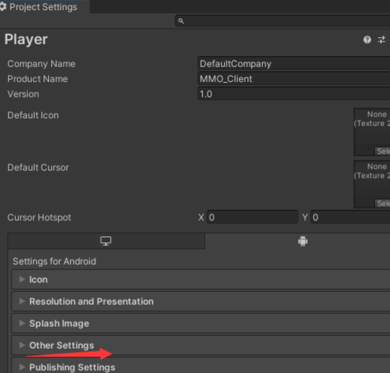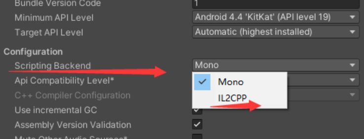 择il2cpp模式。将Unity与自己开发的.net的字节码转成c++代码,用Android的NDK来进行编译。打开PlayerSettings, 选Other Settings