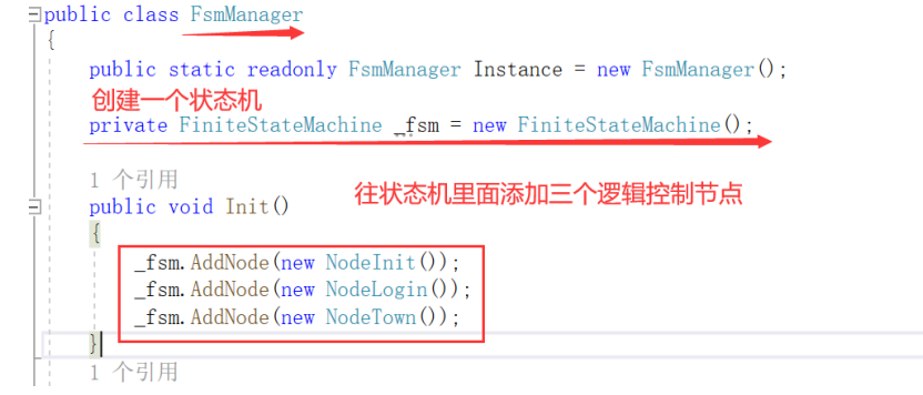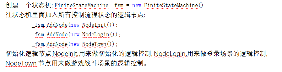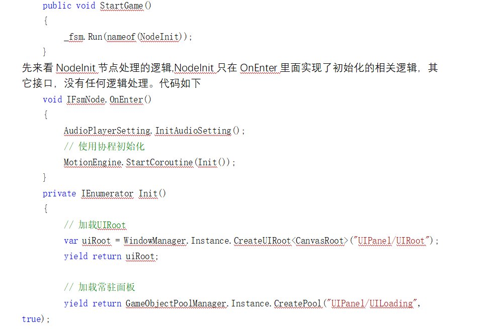 每个状态机节点,都实现IFsmNode所对应的接口,放入到状态机中统一管理。案例中我们在游戏开始时先执行NodeInit状态节点,完成游戏的初始化。
