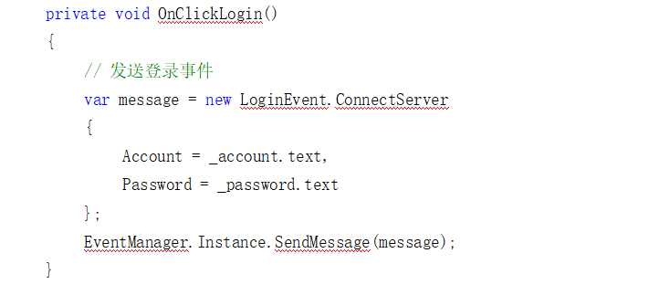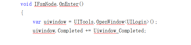 如上面的代码所示, 当状态机执行NodeInit节点状态的时候,会初始化时调用OnEnter接口, NodeInit的OnEnter接口中,调用了Init函数来做初始化,首先会创建一个UIRoot, 然后把资源加载界面显示出来,完成资源加载后,进入到登录逻辑节点场景,注意这里,状态机就由原来的NodeInit切换到NodeLogin状态机节点。当进入NodeLogin节点的时候,就会执行它的OnEnter接口,接下来我们看下登录节点的逻辑处理如下: