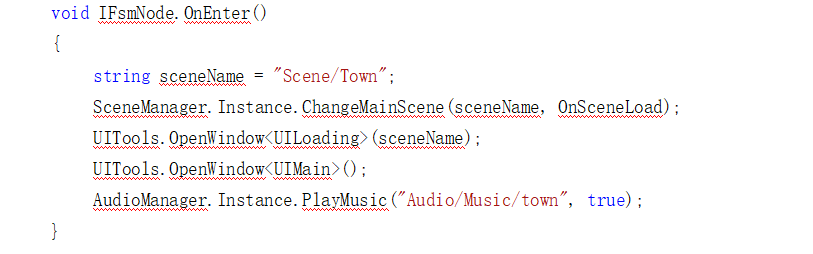 在事件处理函数中,调用状态机切换到NodeTown状态机节点运行。最后我们来看下NodeTown游戏战斗场景中的节点处理,初始化OnEnter接口如下: