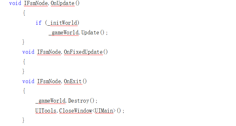 切换到游戏战斗场景,显示战斗的主UI, 播放游戏的背景音乐。在看下其它接口,OnUpdate迭代游戏世界变化,OnExit, 删除掉游戏世界释放掉资源,代码如下: