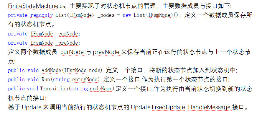 这样驱动了状态机节点的相关接口的调用与执行。写好FiniteStateMachine, IFsmNode两个代码以后,状态机就已经设计完成了,接下来就是具体游戏项目中的使用。也就是与使用相关的代码了。其实非常简单,主要有3步