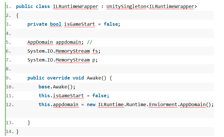 注: Packages记得选”Unity Registry”, 然后安装ILRuntime即可,同时打开Unity PlayerSetting 选unsafecode模式。安装好ILRuntime开发环境后,接下来在项目中实例化ILRuntime的解释器。编写一个ILRuntimeWrapper.cs的全局单例,引入using ILRuntime.Runtime.Enviorment;ILRuntime名字空间,在Awake中实例化ILRuntime解释器实例: this.appdomain = new ILRuntime.Runtime.Enviorment.AppDomain();