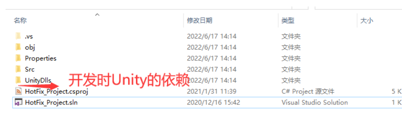 接下来安装第(2)部分, 创建一个基于.net的.dll的工程项目,作为可热更的游戏逻辑项目。 (如果你懒,可以拷贝使用示例代码里面的逻辑热更项目,.net版本和你自己的保持一致即可)这个项目有几个特点:必须最终是要生成.dll的.net动态库,要加上Unity使用的依赖,所以我们专门在这个项目下创建一个文件夹UnityDlls用来存放开发中依赖Unity的动态库。如图所示: